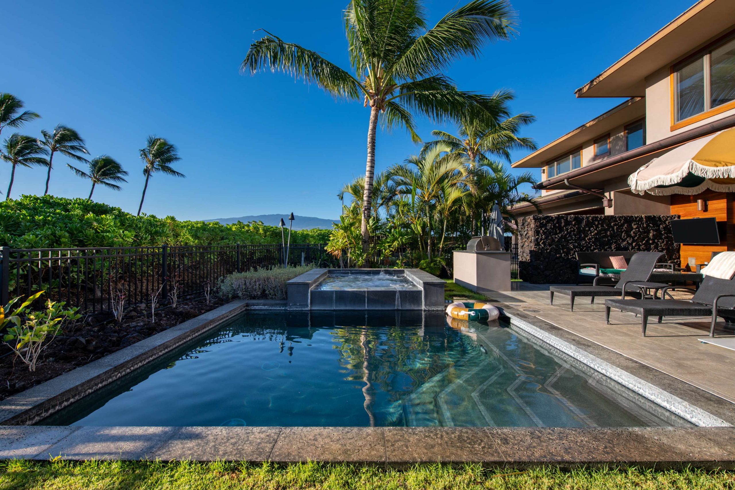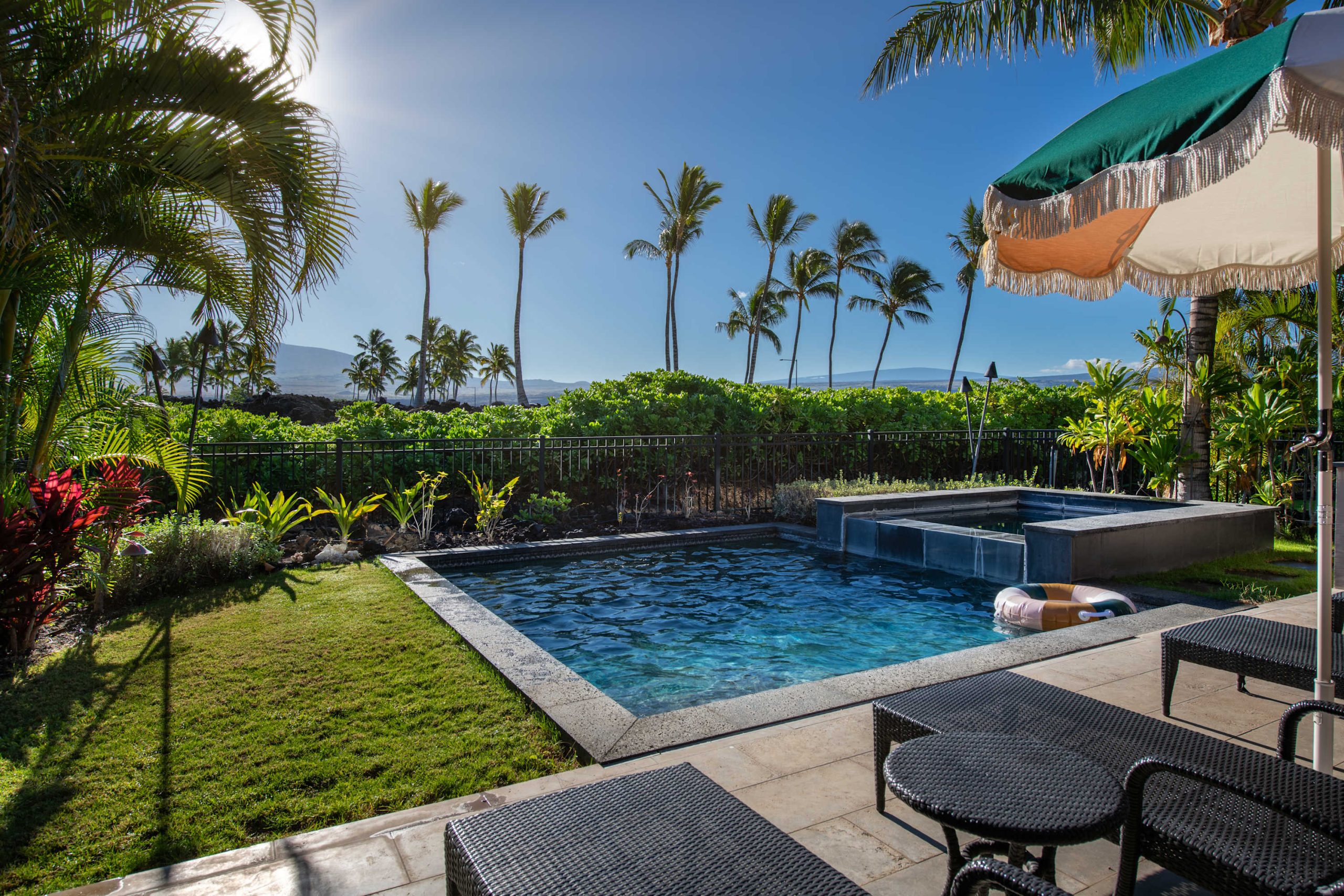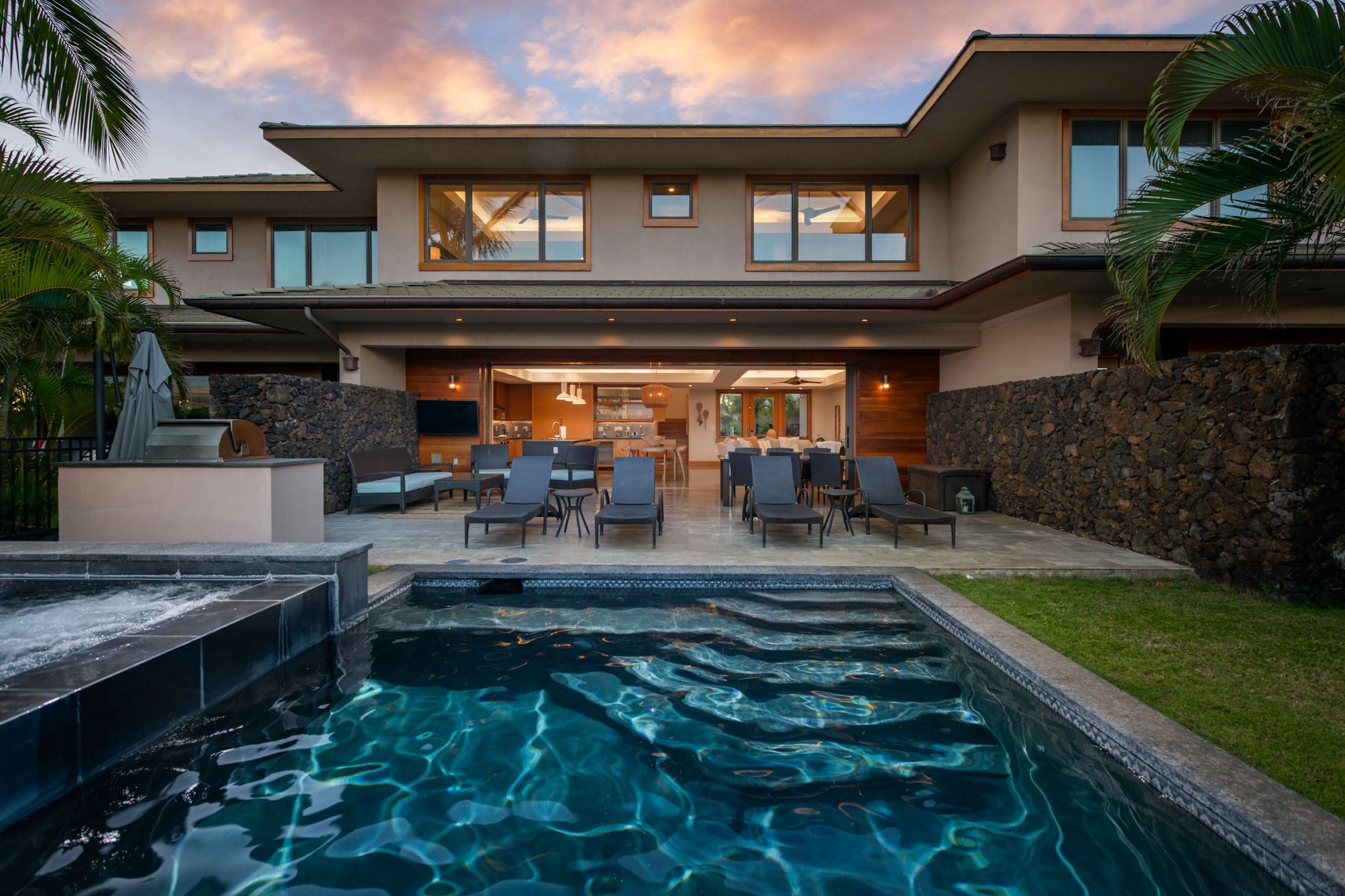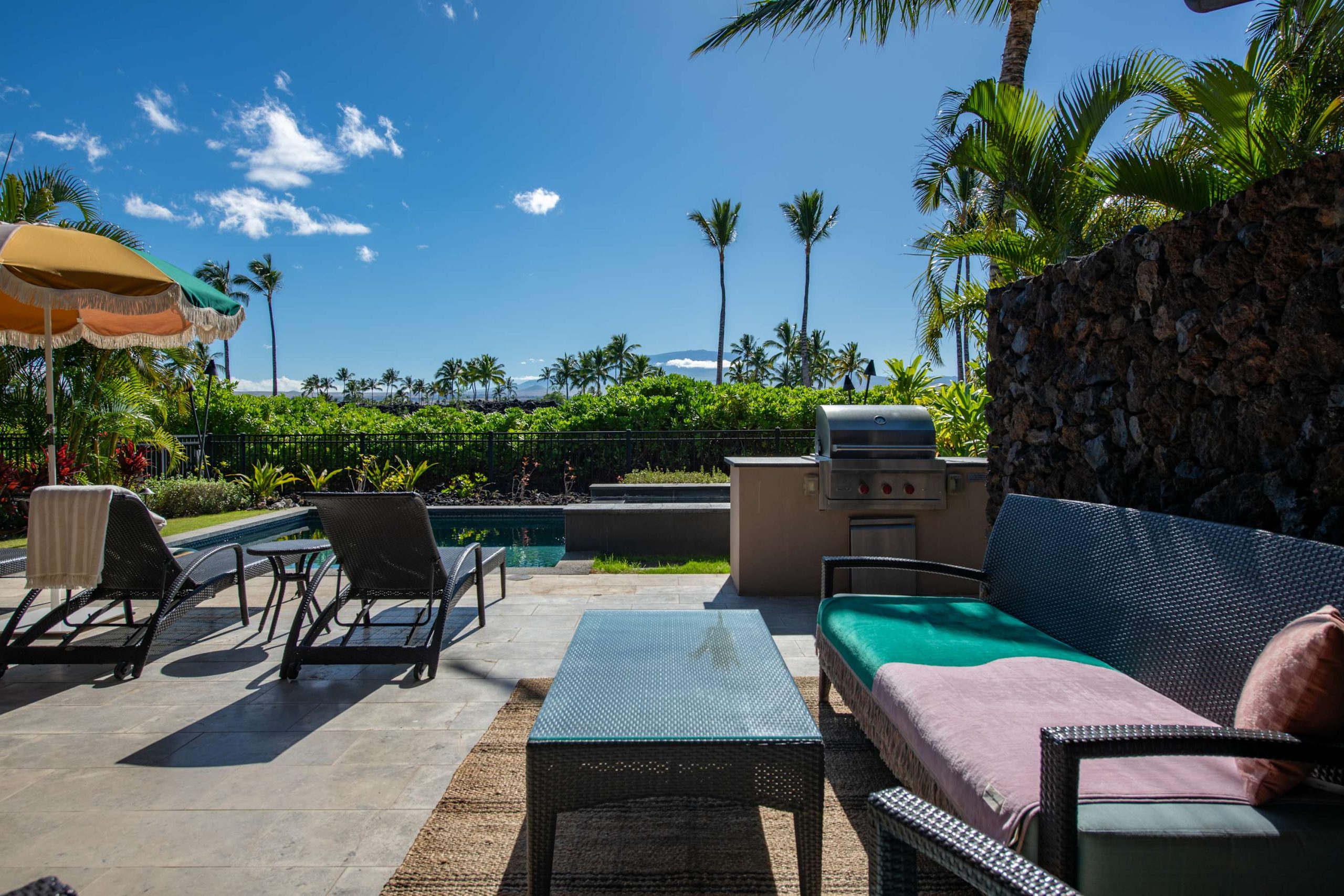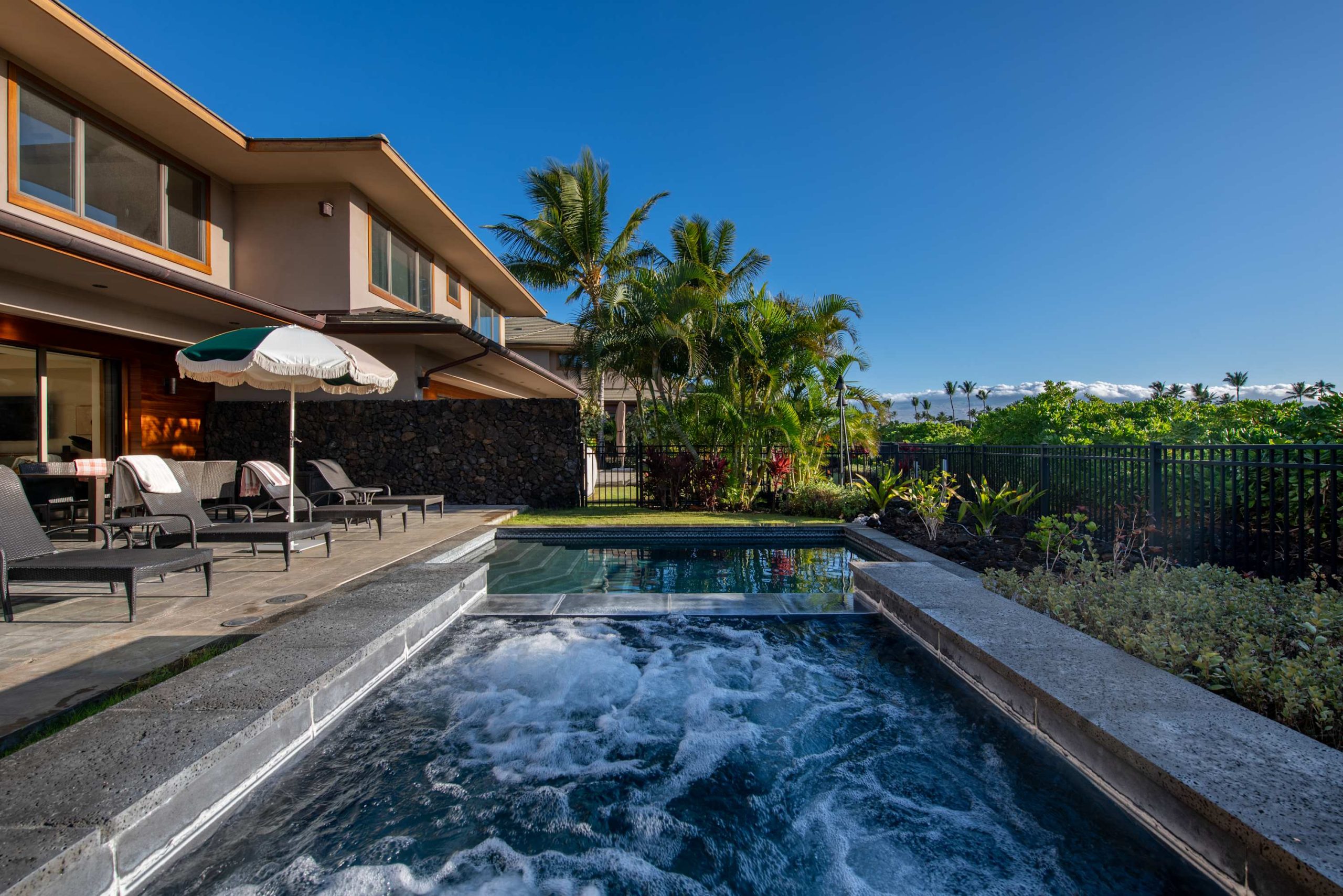 Spend your days lounging at the beach club and enjoy one of the private cabanas free of charge. While relaxing, you can have your food and beverages delivered to you as you lounge. In the evening, take some time to unwind by your private pool or watch the sunset from the second floor lanai overlooking the surrounding mountains. Golf lovers can spend a day playing golf at The Francis I’I Brown South Course right in the home’s backyard.