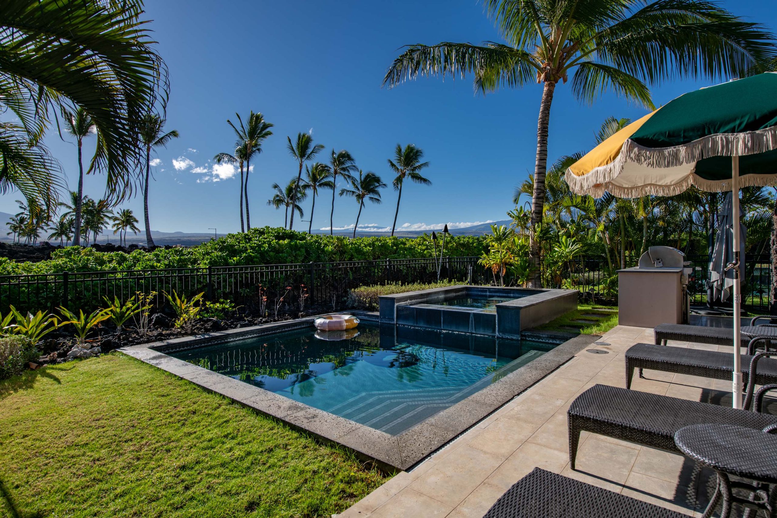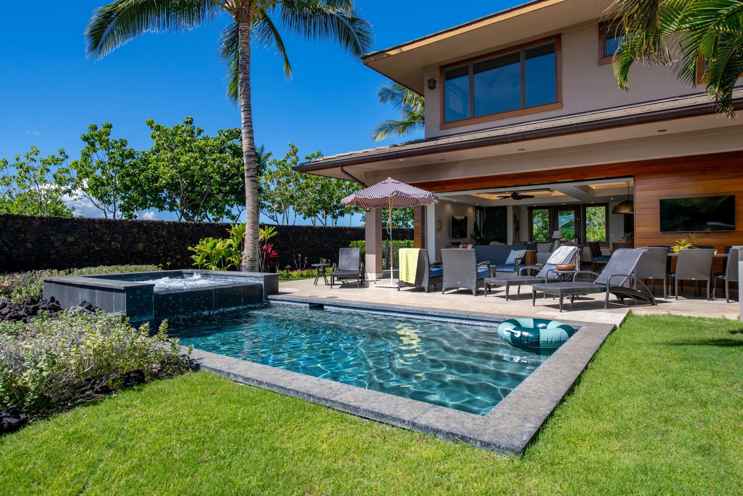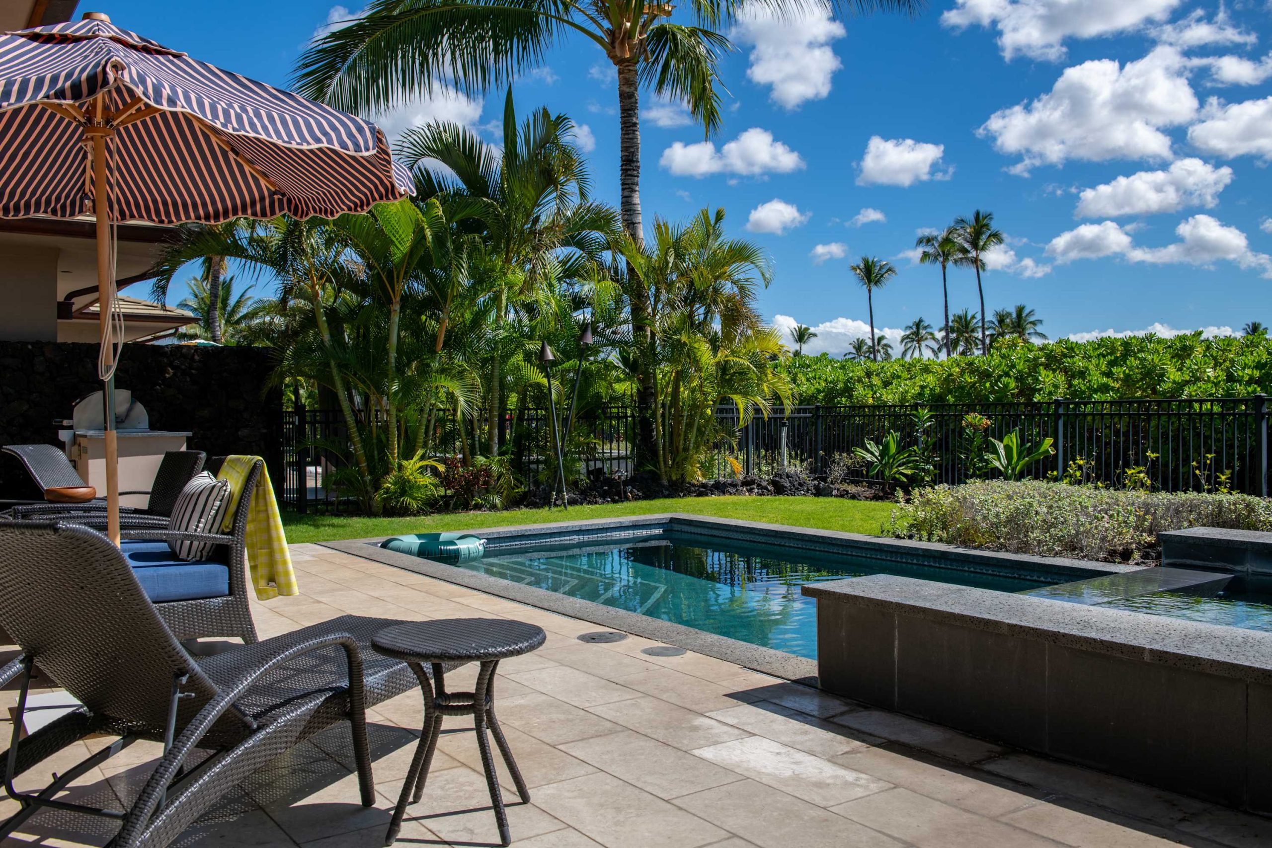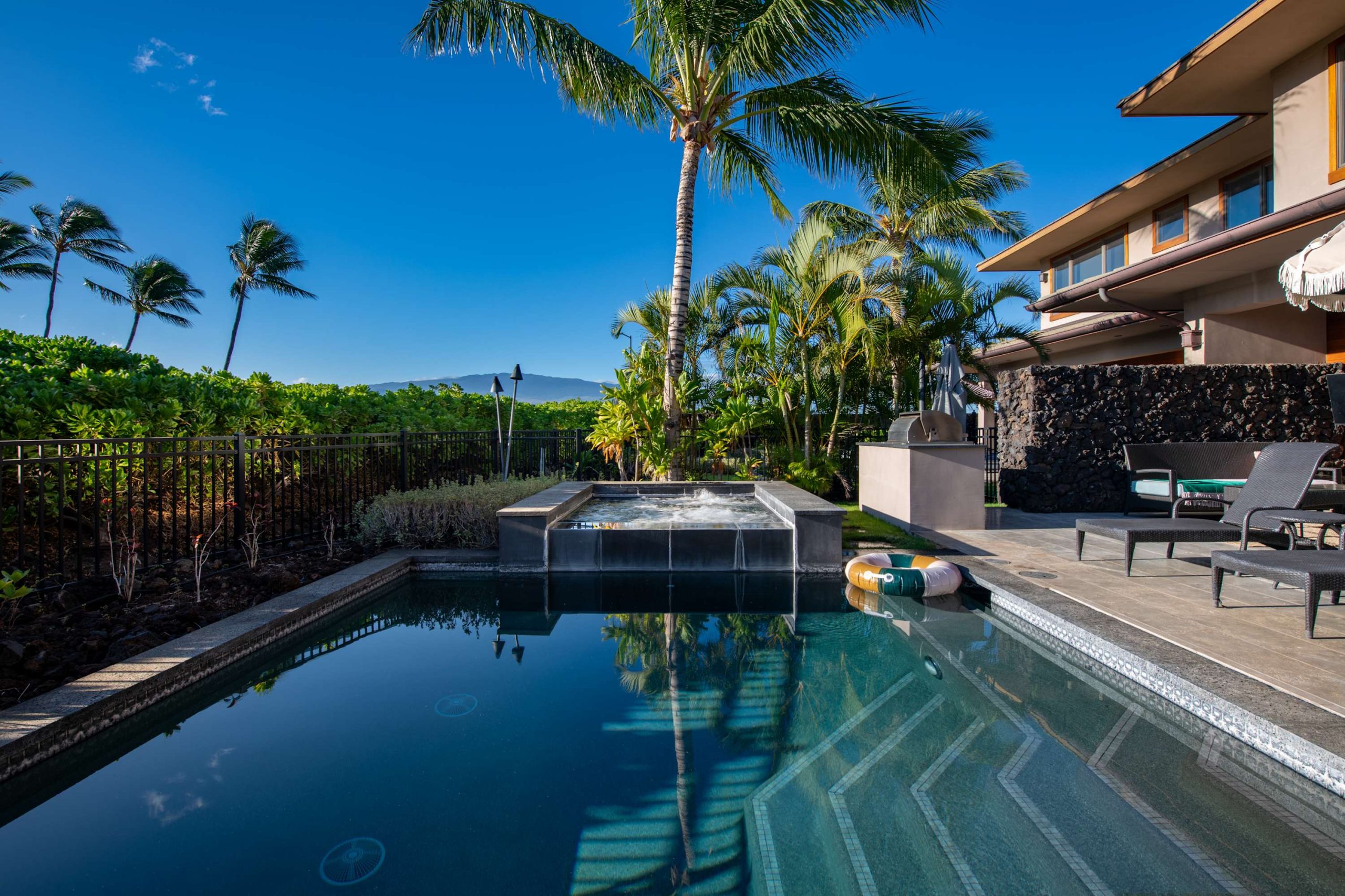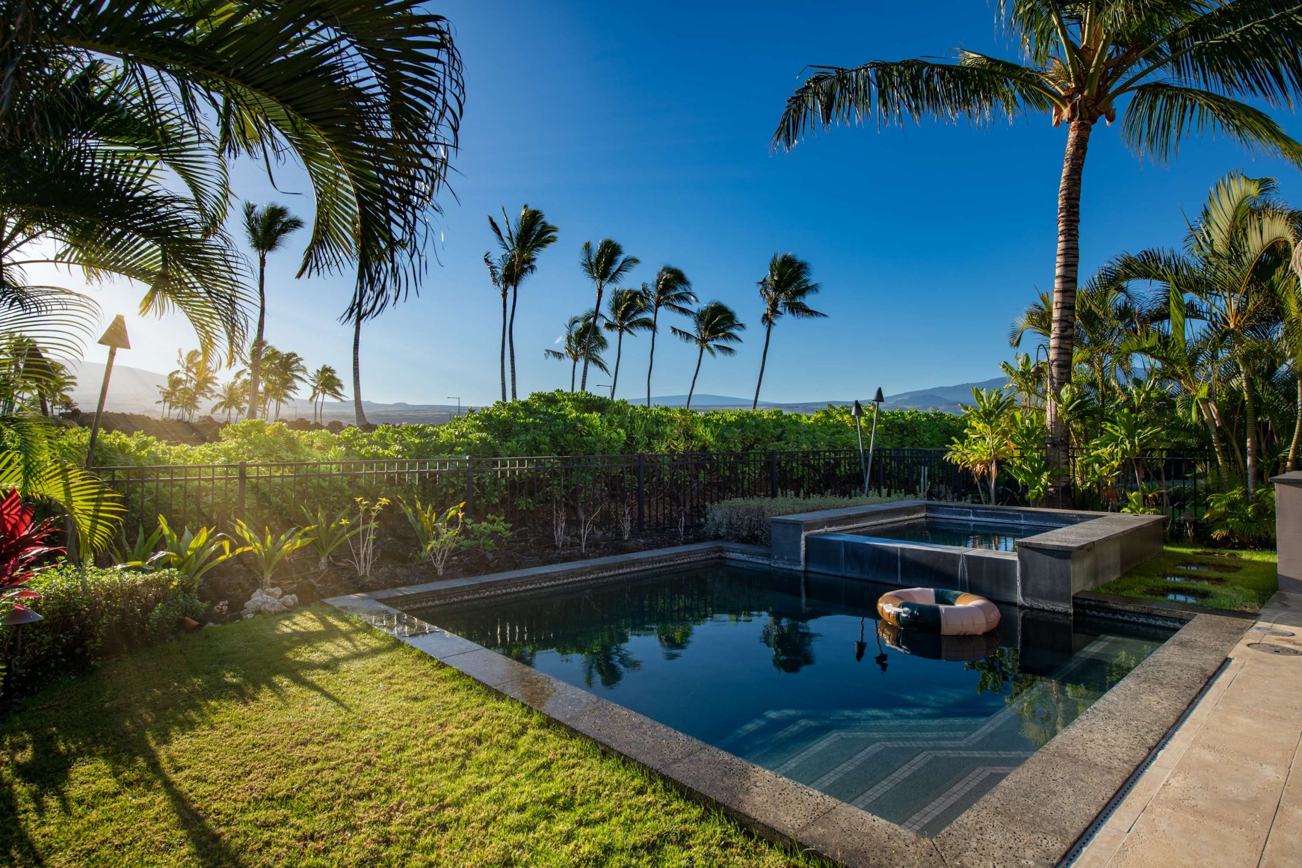 Spend your days lounging at the beach club and enjoy one of the private cabanas free of charge. While relaxing, you can have your food and beverages delivered to you as you lounge. In the evening, take some time to unwind by your private pool or watch the sunset from the second floor lanai overlooking the surrounding mountains. Golf lovers can spend a day playing golf at The Francis I’I Brown South Course right in the home’s backyard.