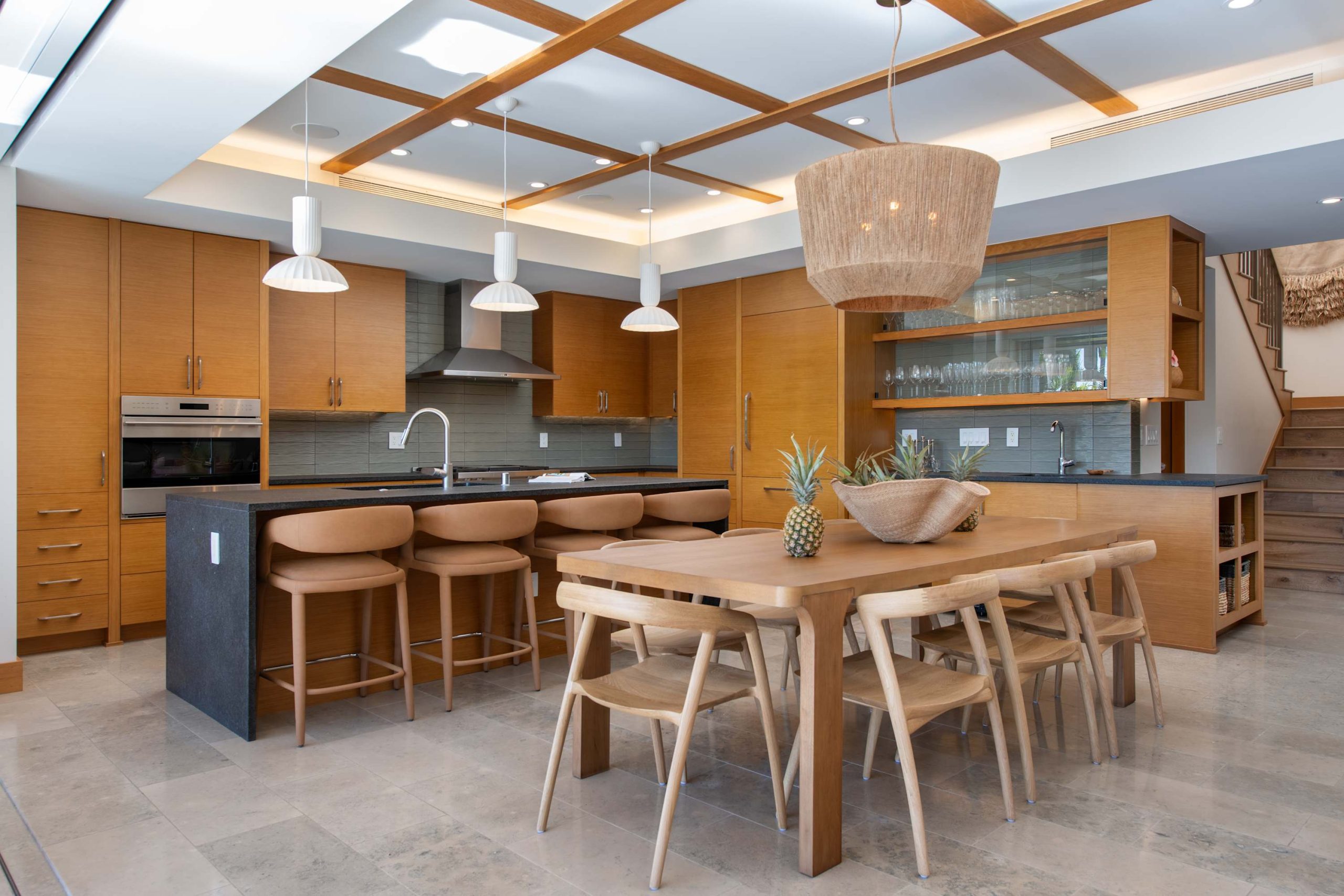 Stone flooring and hardwood finishes throughout
